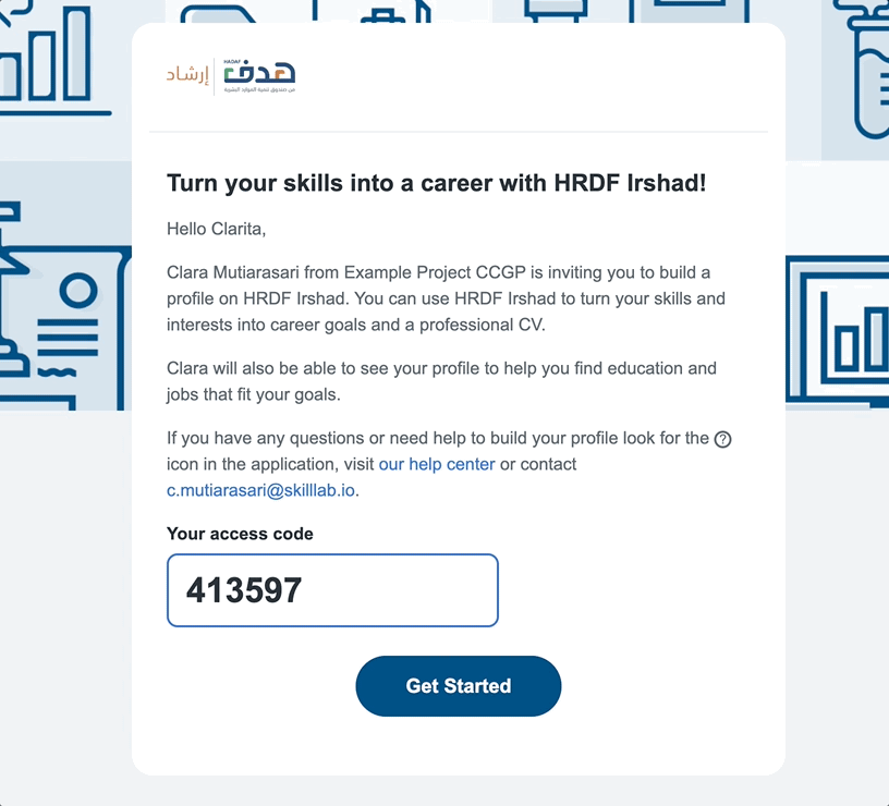 When a counselor invites you to join and access the CCG Portal, you will receive an email from HRDF Irshad with an access code. To start creating your account in the portal, open the email and click Get Started.